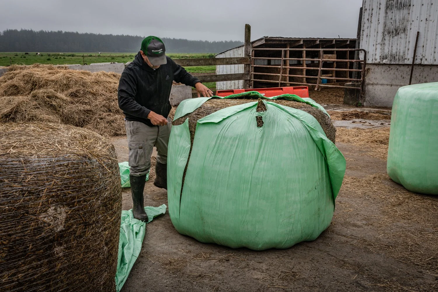 Plastic wrap allows hay to be cut sooner and immediately baled. Wrapped hay ferments like silage. Baleage is higher in protein and more palatable for the cows than dry hay.